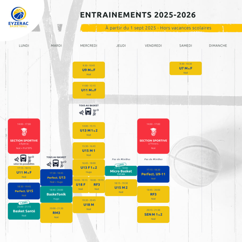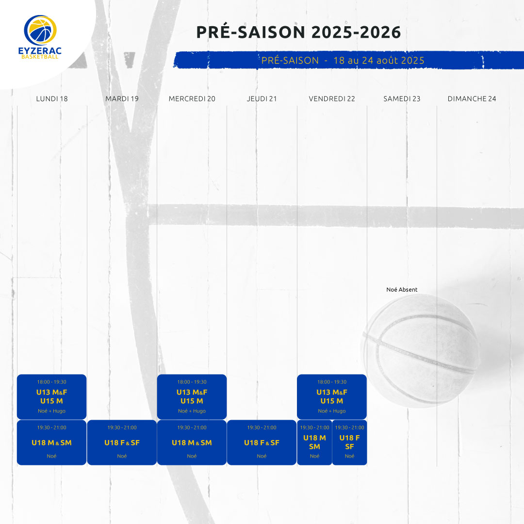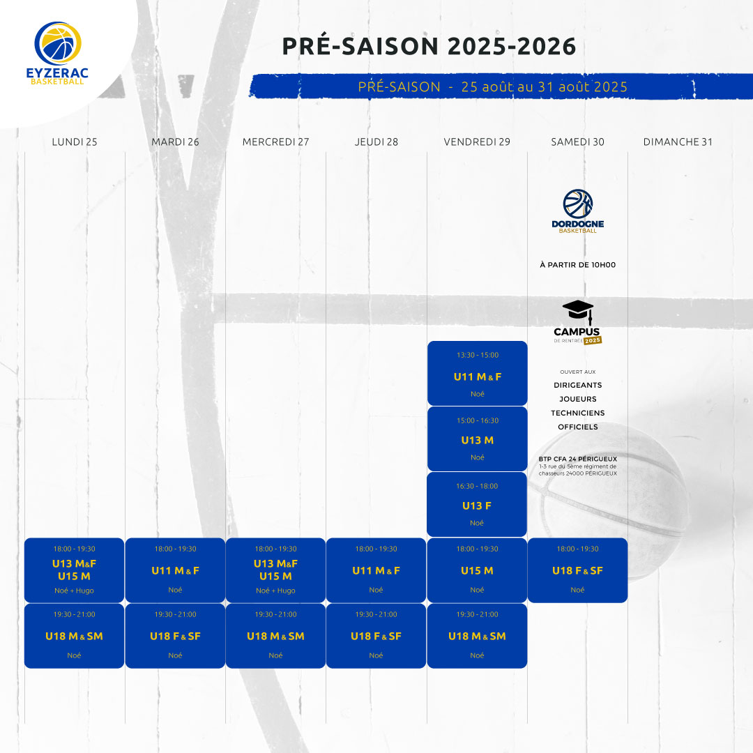 La Pré-saison débute le 18 août. La planification 2025-2026 commence le 1 septembre (hors vacances scolaires). Tous les joueurs.ses viennent en tenue de sport, avec gourde et chaussures de BasketBall.